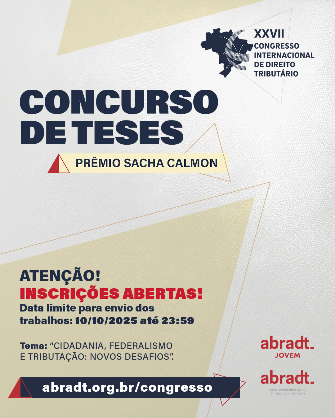 Com o tema central “Cidadania, Federalismo e Tributação: Novos Desafios”, o Concurso de Teses está com edital e inscrição disponíveis no site abradt.org.br/congresso.