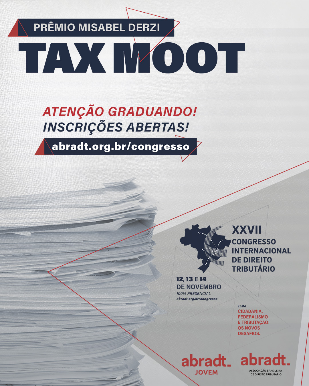 A ABRADT convida estudantes de Direito a participarem do prestigiado Tax Moot – Prêmio Misabel Derzi, com inscrições abertas até 1º de outubro de 2025. Este evento, parte do XXVII Congresso Internacional de Direito Tributário, oferece a oportunidade única de simular um julgamento, apresentando memoriais e sustentando argumentos orais em debates jurídicos.