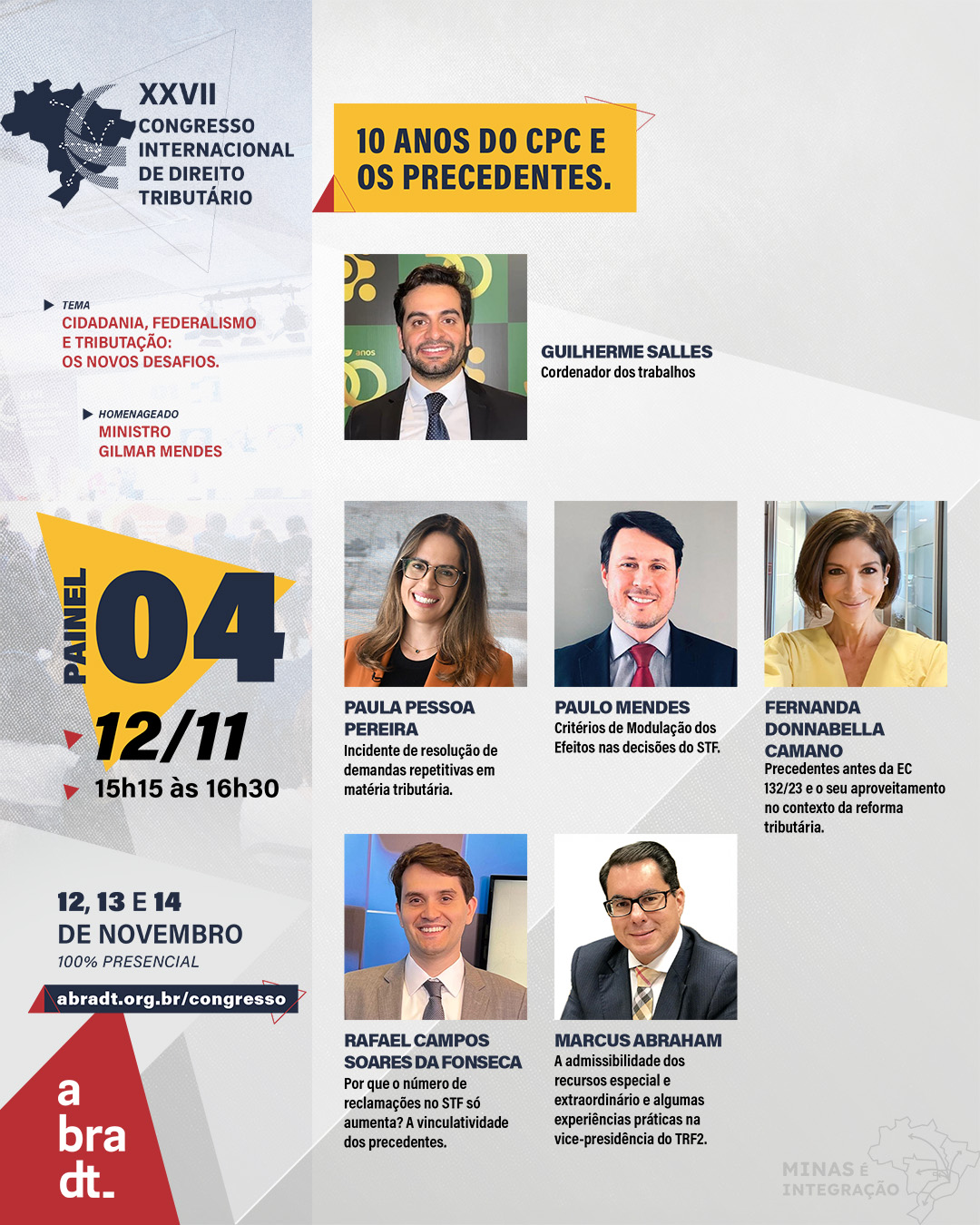 O XXVII Congresso Internacional de Direito Tributário da ABRADT está se aproximando, e com ele uma oportunidade única de discutir temas cruciais para o cenário jurídico tributário brasileiro. Entre os painéis confirmados, destaca-se o Painel 4: “10 anos do CPC e a teoria dos precedentes”, que ocorrerá no dia 12 de novembro, das 15h15 às 16h30, em Belo Horizonte/MG.