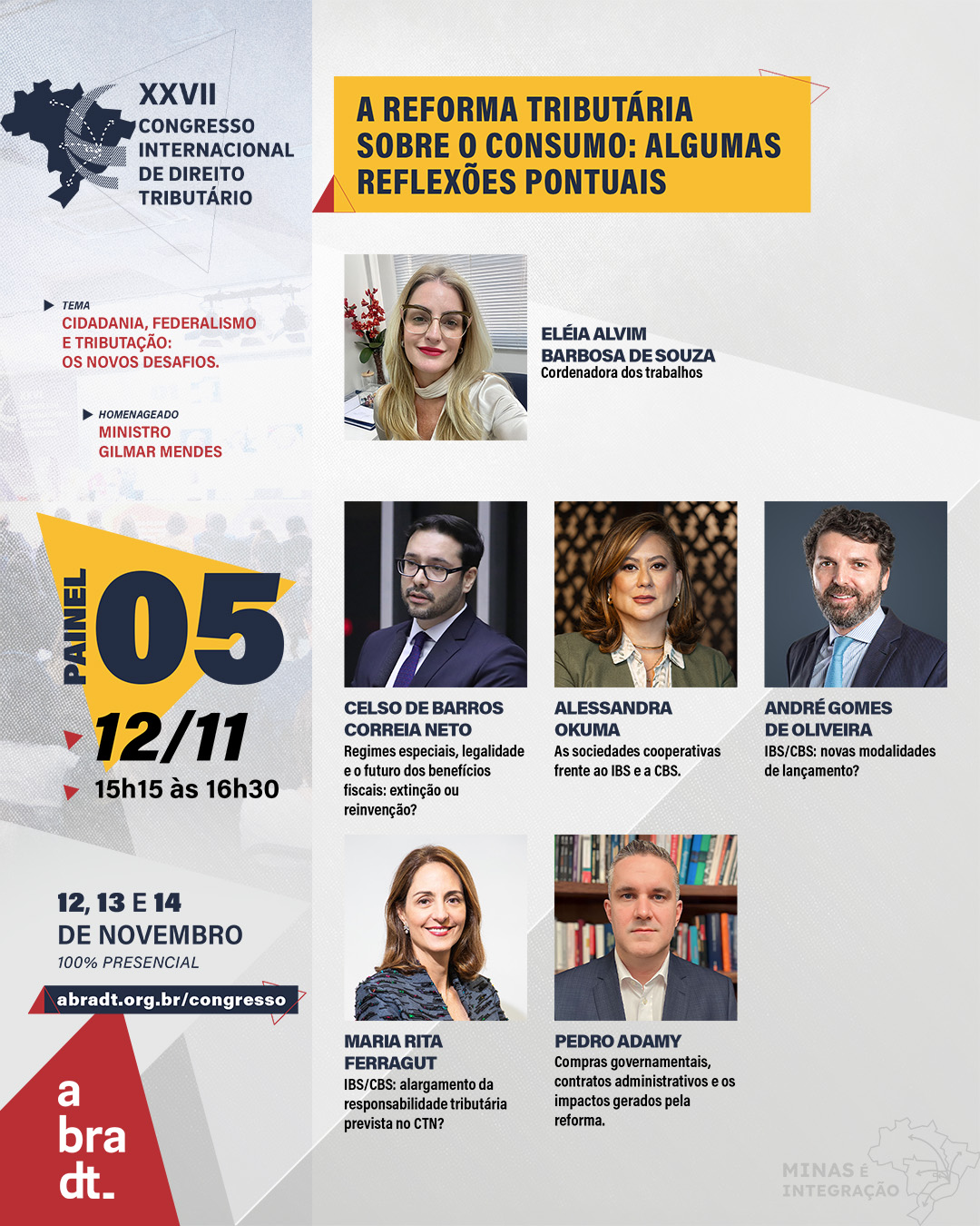 Celso de Barros Correia Neto discutirá “Regimes especiais, legalidade e o futuro dos benefícios fiscais: extinção ou reinvenção?”, enquanto Alessandra Okuma abordará “As sociedades cooperativas frente ao IBS e a CBS”. André Gomes de Oliveira e Maria Rita Ferragut trarão suas perspectivas sobre as novas modalidades de lançamento e o alargamento da responsabilidade tributária prevista no CTN, respectivamente. Por fim, Pedro Adamy tratará dos impactos da reforma nas compras governamentais e contratos administrativos.