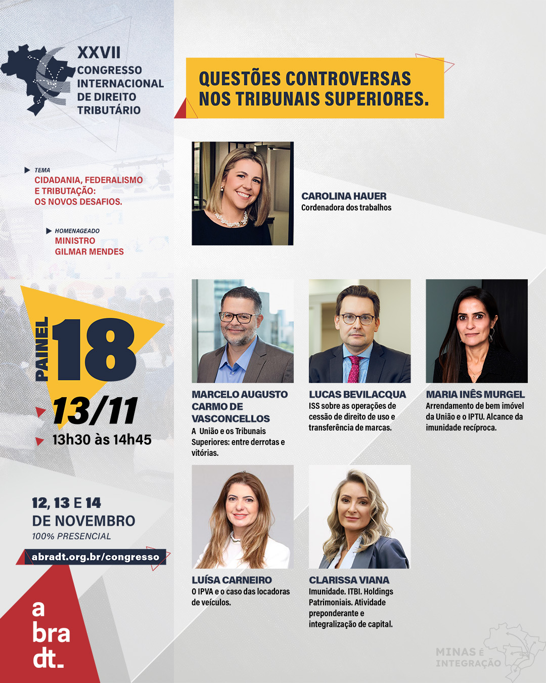 No ano em que o tema central do XXVII Congresso Internacional de Direito Tributário da ABRADT é “Cidadania, Federalismo e Tributação: os novos desafios”, o painel 18 promete uma discussão instigante sobre “Questões controversas nos Tribunais Superiores”. O evento ocorrerá em Belo Horizonte nos dias 12, 13 e 14 de novembro de 2025, reunindo especialistas de todo o Brasil para debater e propor soluções concretas para os desafios tributários do país.