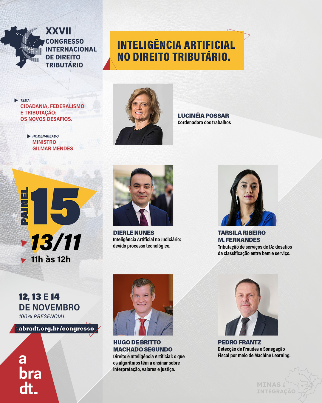 - Tarsila Ribeiro M. Fernandes, com a palestra “Tributação de serviços de IA: desafios da classificação entre bem e serviço”, abordará as complexidades da tributação no contexto da IA.