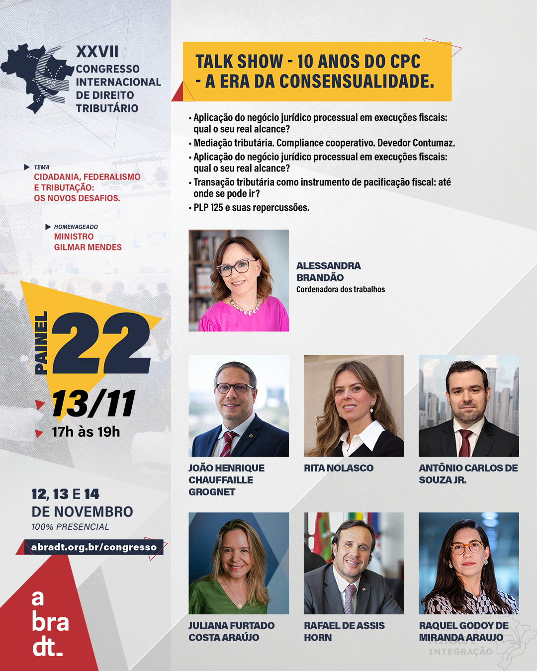 O XXVII Congresso Internacional de Direito Tributário da ABRADT, que ocorre entre os dias 12 e 14 de novembro de 2025 em Belo Horizonte/MG, apresenta o Painel 22 no formato de talk show, celebrando uma década do Código de Processo Civil (CPC) e sua era da consensualidade. Este painel, que ocorrerá no dia 13 de novembro, das 16h30 às 18h30, é uma oportunidade única para discutir a aplicação do negócio jurídico processual em execuções fiscais e a mediação tributária.