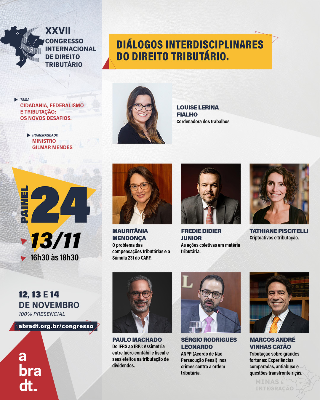 O painel contará com a participação de Mauritânia Mendonça, que abordará “O problema das compensações tributárias e a Súmula 231 do CARF”, trazendo uma análise crítica sobre uma questão que afeta diretamente a prática tributária no Brasil. Fredie Didier Junior discutirá “As ações coletivas em matéria tributária”, oferecendo uma perspectiva sobre o impacto e a eficácia desses instrumentos no cenário jurídico atual.