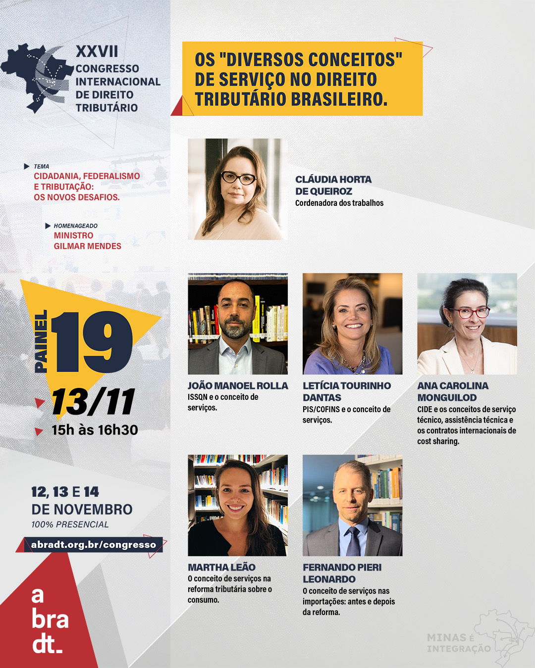 Os palestrantes trarão perspectivas valiosas: João Manoel Rolla discutirá o ISSQN e sua interpretação de serviços; Letícia Tourinho Dantas analisará o conceito no âmbito do PIS/COFINS; Ana Carolina Monguilod oferecerá insights sobre a CIDE e os serviços técnicos, assistência técnica e contratos internacionais de cost sharing; Martha Leão abordará as mudanças propostas pela reforma tributária sobre consumo; e Fernando Pieri Leonardo tratará das importações, comparando os conceitos pre e pós-reforma.
