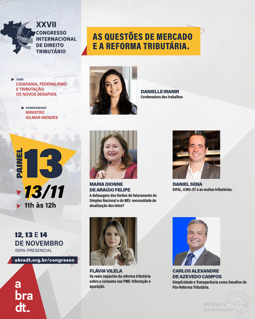 Dentro da programação, destaca-se o Painel 13: “As questões de mercado e a reforma tributária”, agendado para o dia 13 de novembro, das 11h às 12h. Sob a coordenação de Danielle Iranir, este painel se debruçará sobre temas cruciais que impactam diretamente o mercado e a estrutura tributária nacional.