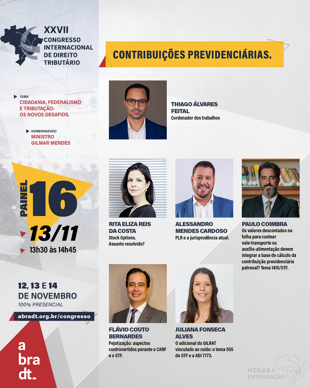 Rita Eliza Reis da Costa iniciará as discussões com a palestra “Stock Options. Assunto resolvido?”, seguido por Alessandro Mendes Cardoso que trará à tona “PLR e a jurisprudência atual”. Paulo Coimbra discutirá a questão: “Os valores descontados na folha para custear vale-transporte ou auxílio-alimentação devem integrar a base de cálculo da contribuição previdenciária patronal? Tema 1415/STF”. Flávio Couto Bernardes abordará “Pejotização: aspectos controvertidos perante o CARF e o STF”, enquanto Juliana Fonseca Alves tratará de “O adicional do GILRAT vinculado ao ruído: o tema 555 do STF e a ADI 7773”.